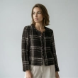 Details: Textured woven fabric, check pattern, collarless design, and cropped length