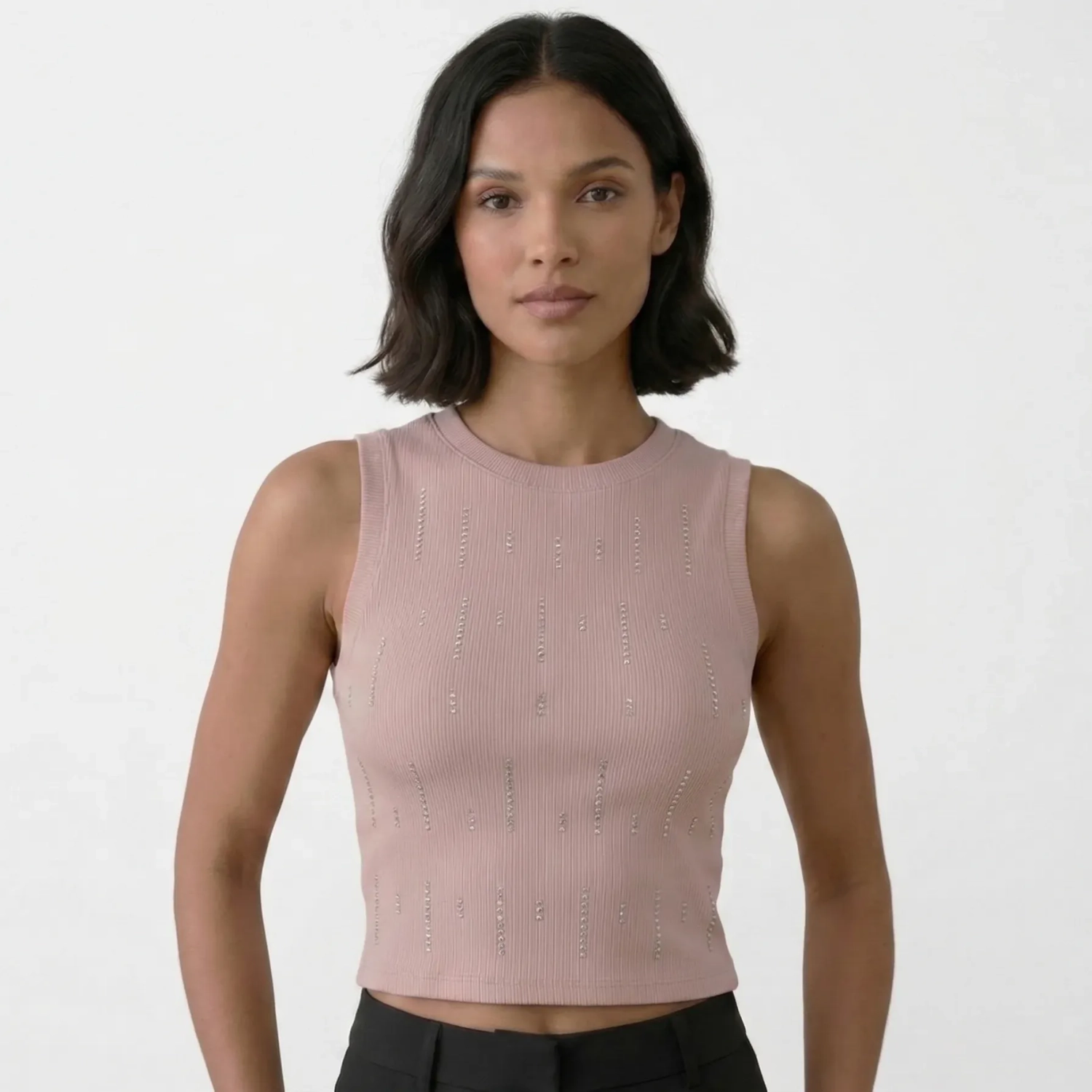 Design Details: Sleeveless cut featuring a delicate arrangement of crystals for a touch of sparkle