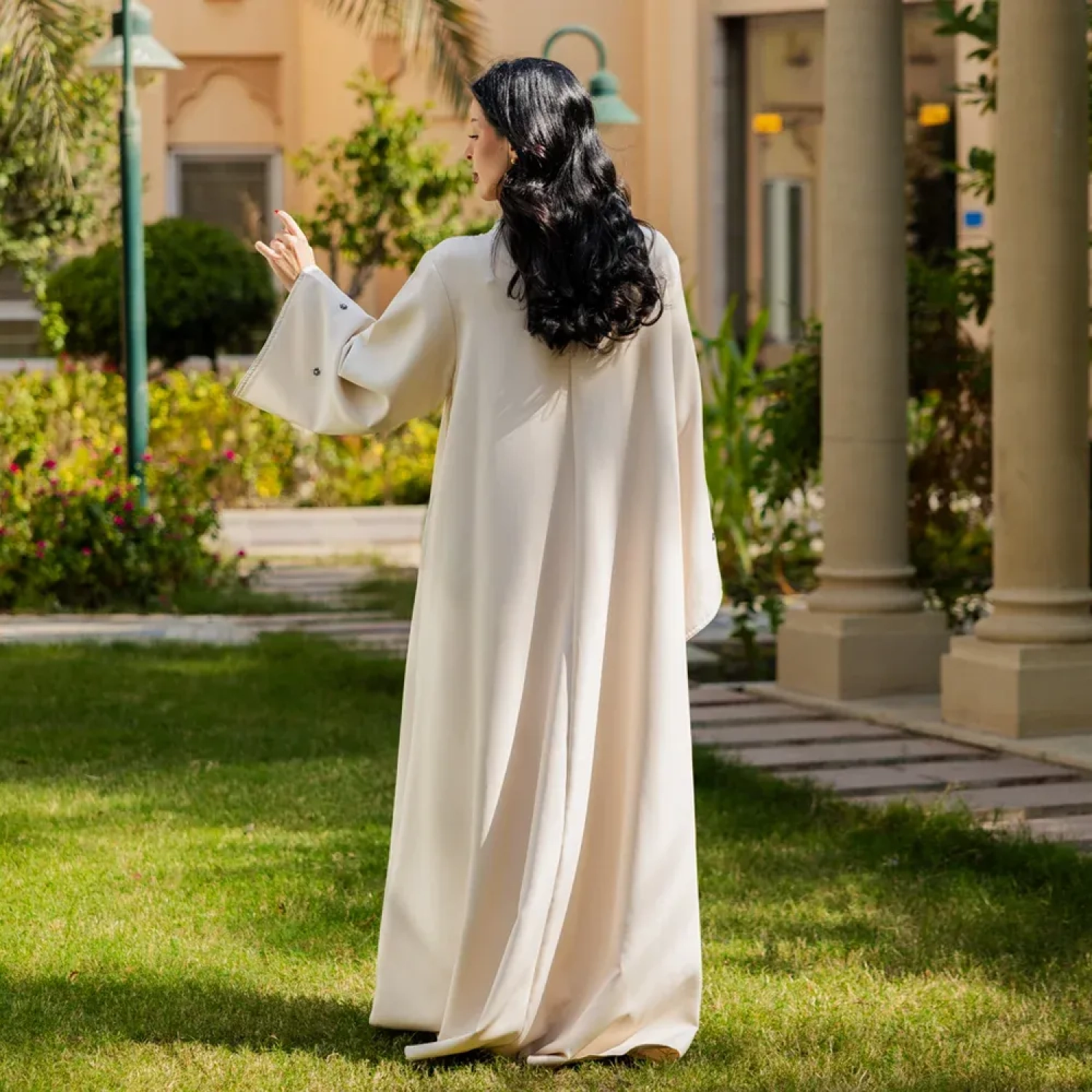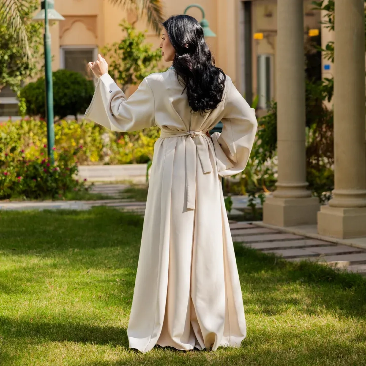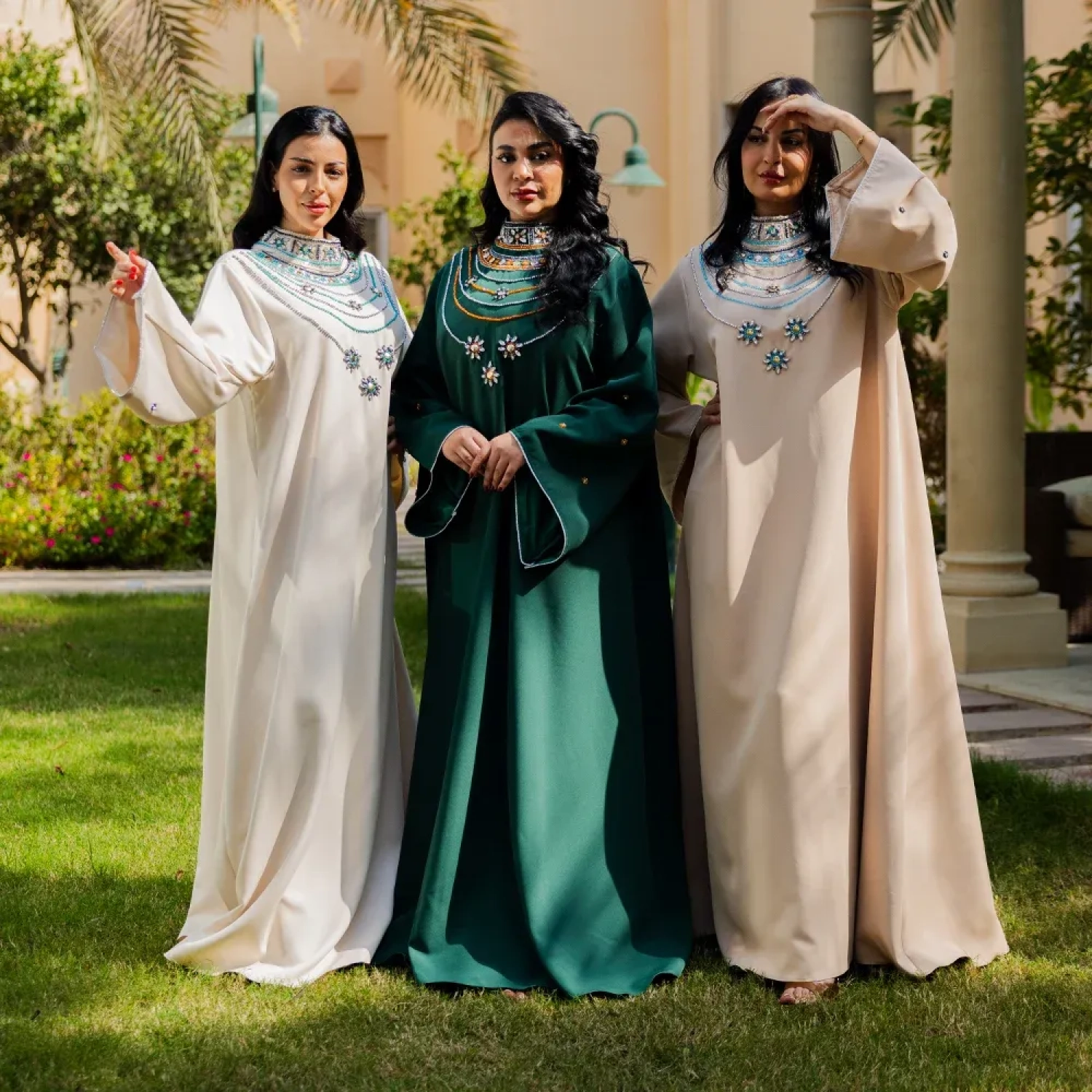 Flowy modest Jalabiya with delicate bead detailing. It is lightweight and wrinkle-resistant. Perfect outfit for any festive occasion.