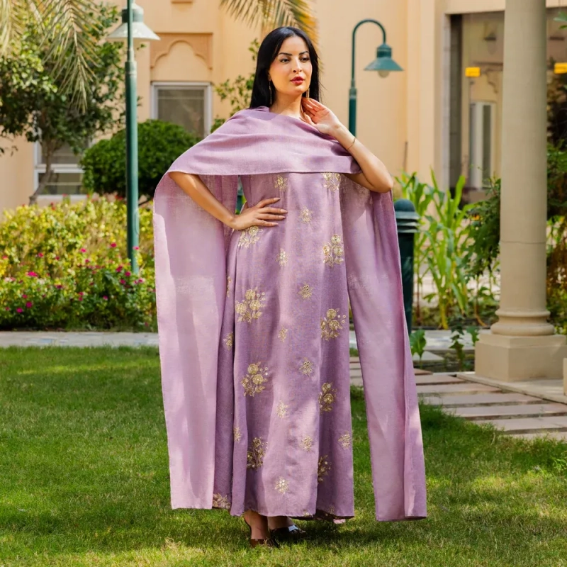 Women's Elegant Regular-Fit Closed Abaya - Embroidered Linen, Festive Wear - Purple & Gold