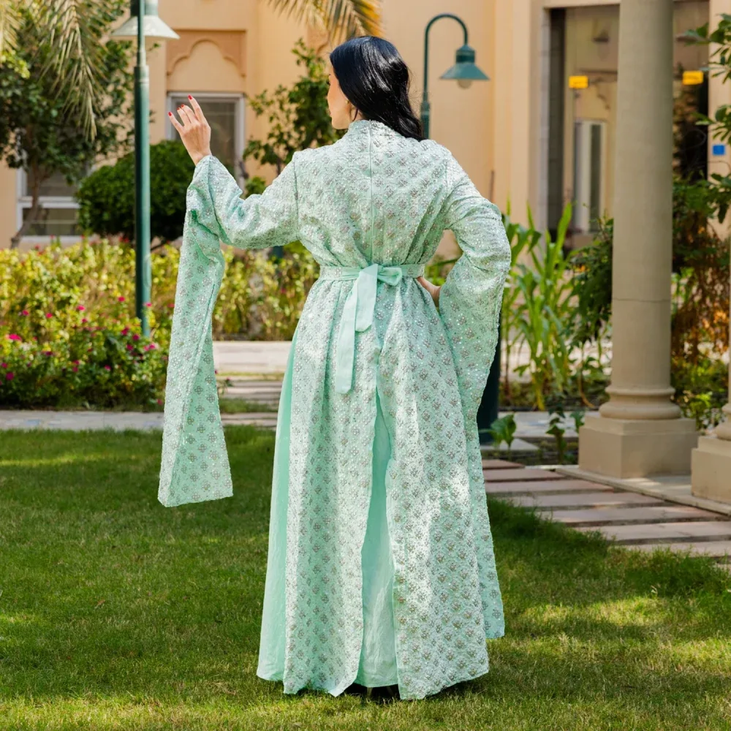 Kuwaiti daraa with delicate embroidery and bead details for classy, festive and elegant look, perfect for festive gatherings.. Made from lightweight linen, it ensures comfort and graceful movement.