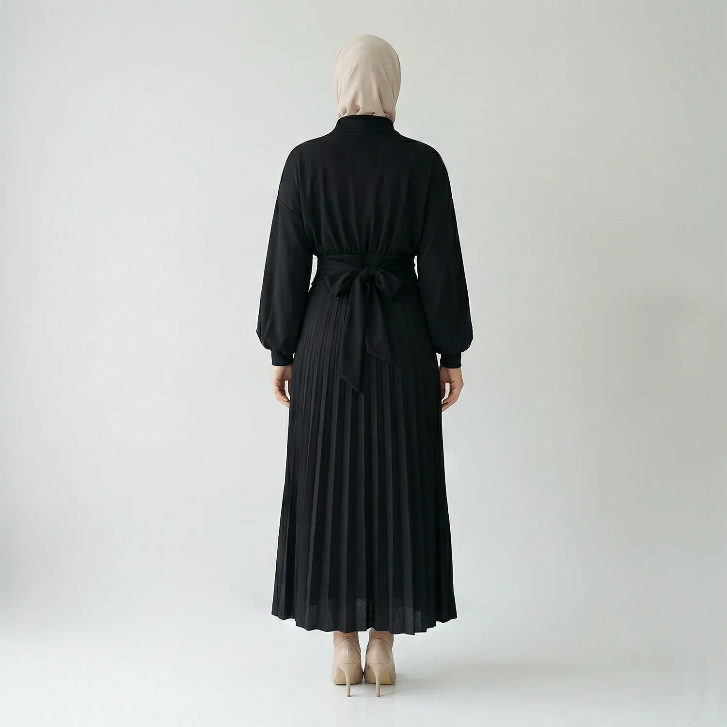 This sophisticated two-piece set is designed to create a polished and cohesive look, perfect for modest fashion and elegant style. It features a long-sleeve, high-neck top with voluminous sleeves, and a matching high-waisted, pleated maxi skirt, all in a beautiful shade.