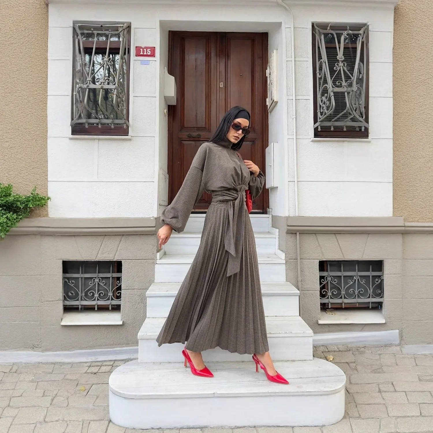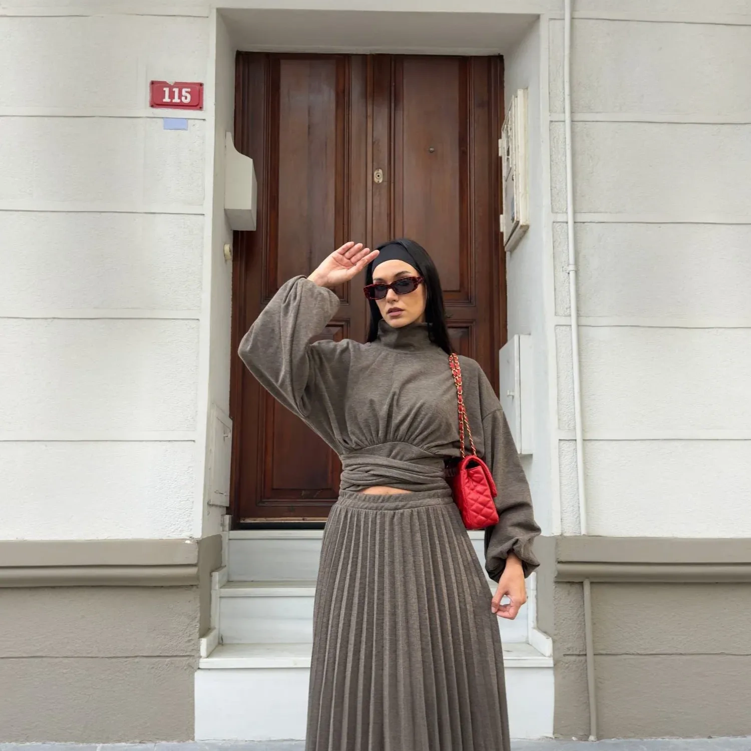 This sophisticated two-piece set is designed to create a polished and cohesive look, perfect for modest fashion and elegant style. It features a long-sleeve, high-neck top with voluminous sleeves, and a matching high-waisted, pleated maxi skirt, all in a beautiful shade.