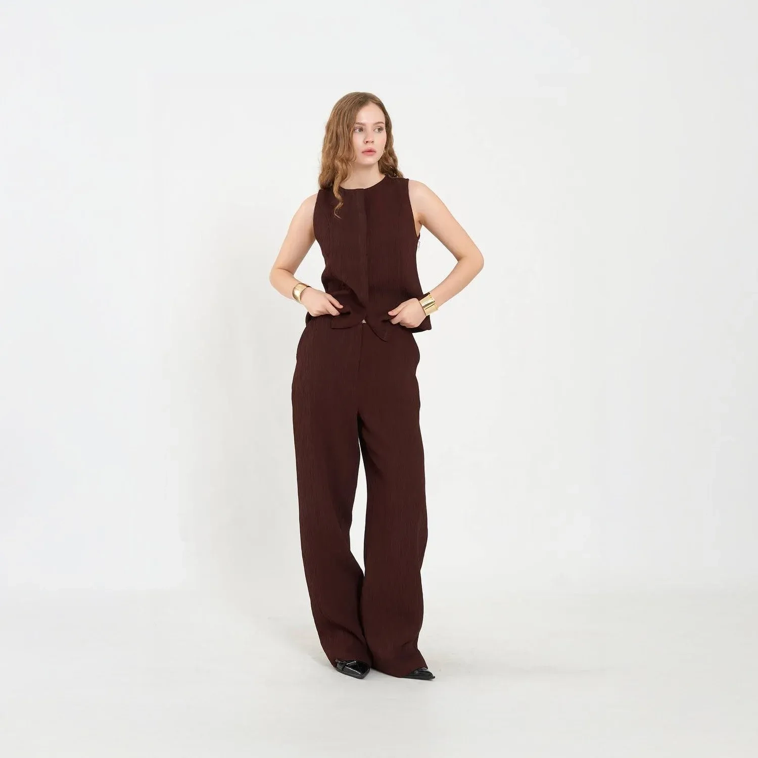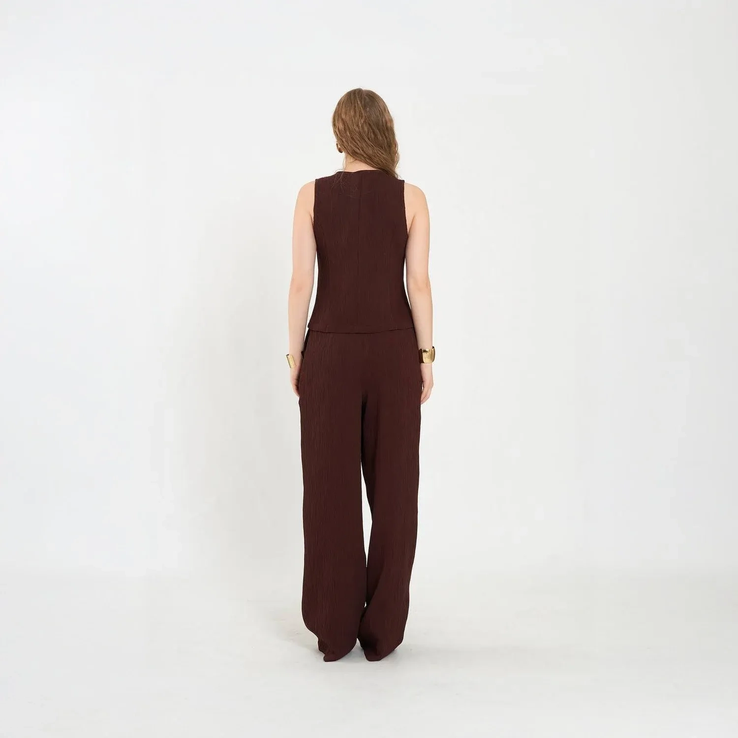 Flattering Wide-Leg Cut: The structured drape of the pants balances the relaxed vest for a well-proportioned silhouette.
