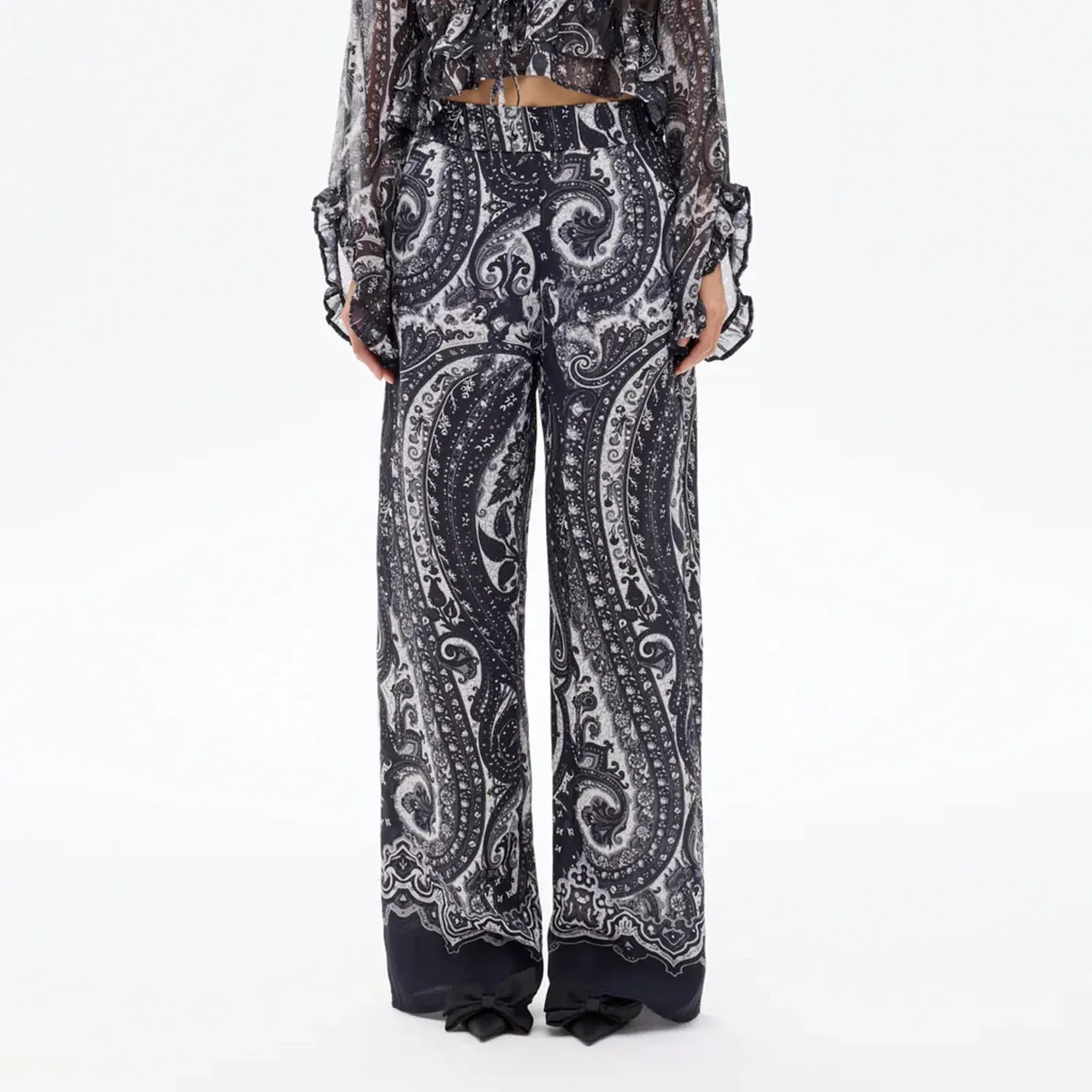 These modern patterned pants are designed for effortless casual and smart-casual style. They feature a flowing wide-leg silhouette and a striking black and white paisley print that adds a bold, chic touch to any outfit. The soft, flowy fabric ensures all-day comfort and a graceful drape that moves beautifully with you.