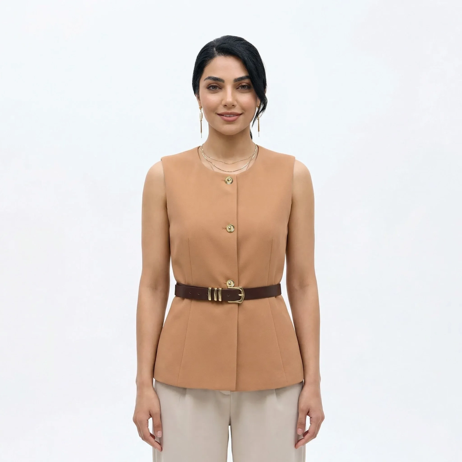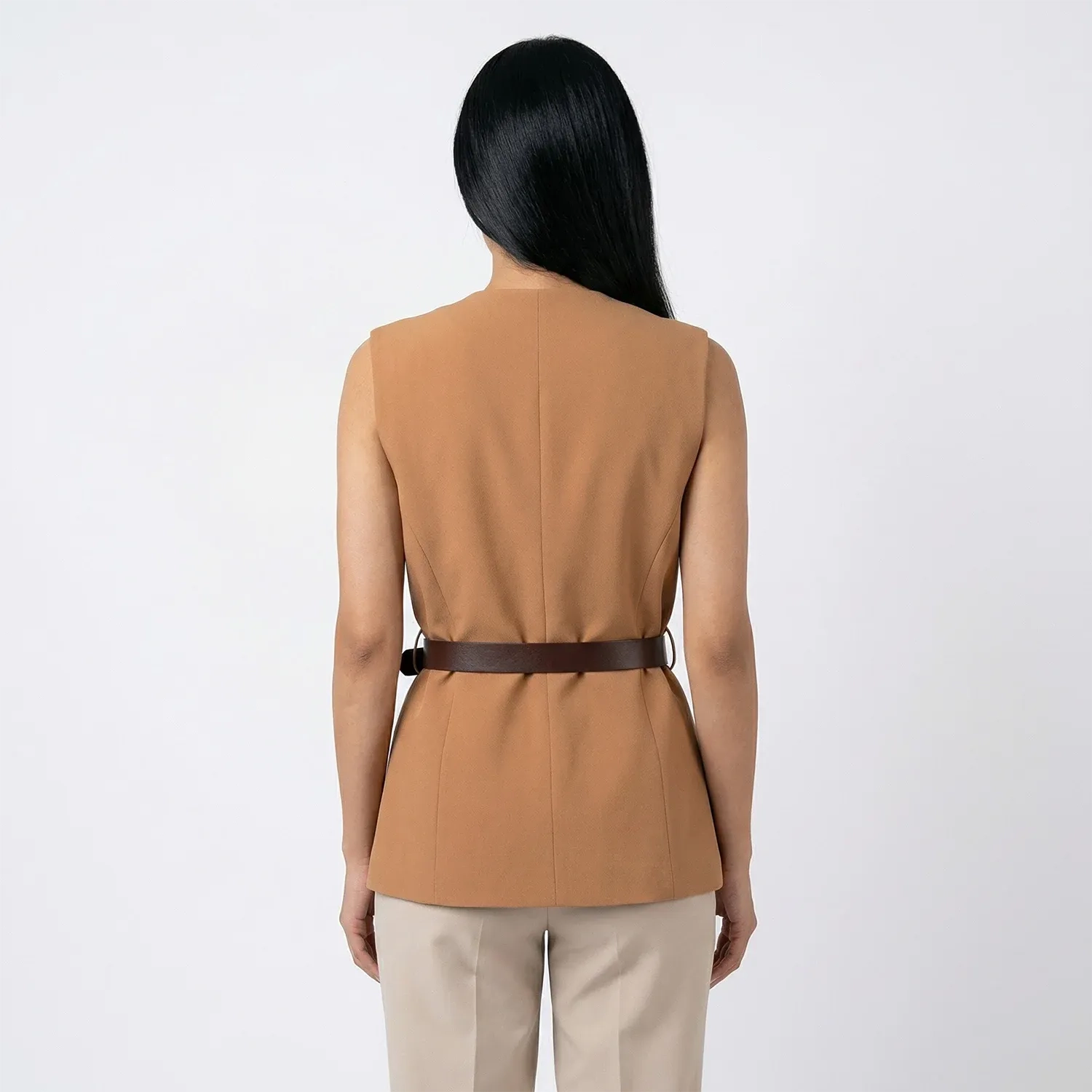 This belted sleeveless vest top is designed to add a refined and stylish touch to