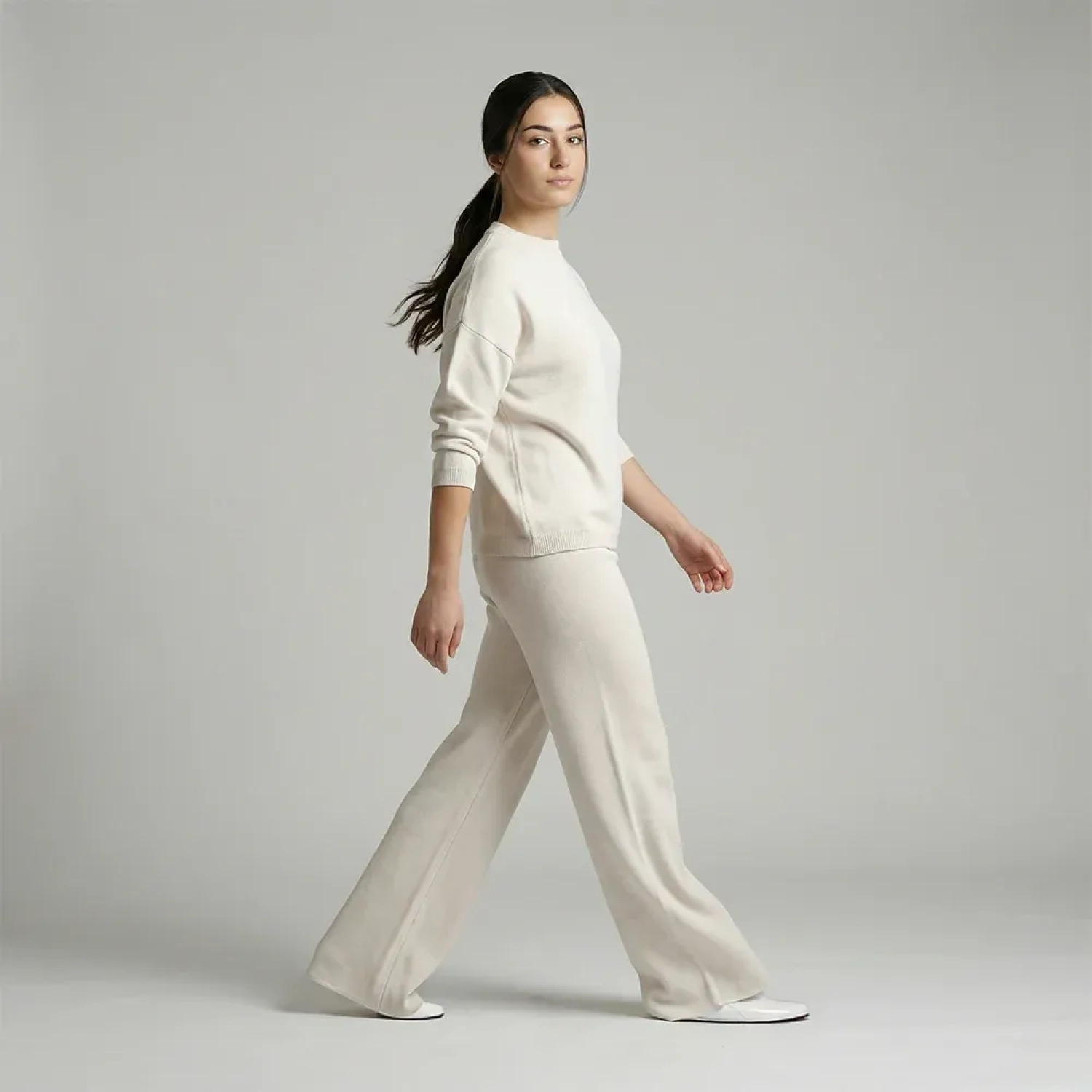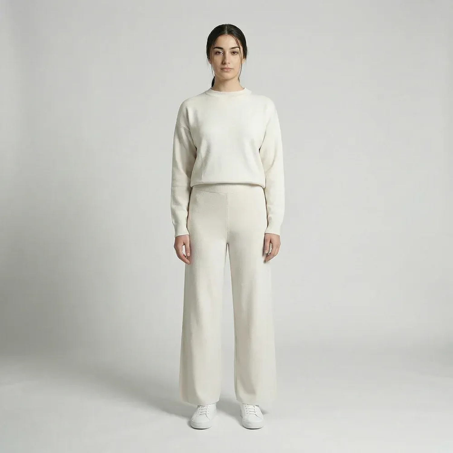 This elegant knitwear set, featuring a long sleeve top and matching wide-leg pants, is designed for ultimate comfort with a chic and modern look. The soft, cozy material drapes beautifully, creating a relaxed yet polished silhouette that’s perfect for everyday wear. Wear the set together for a clean, stylish outfit or style each piece separately for versatile and effortless looks.