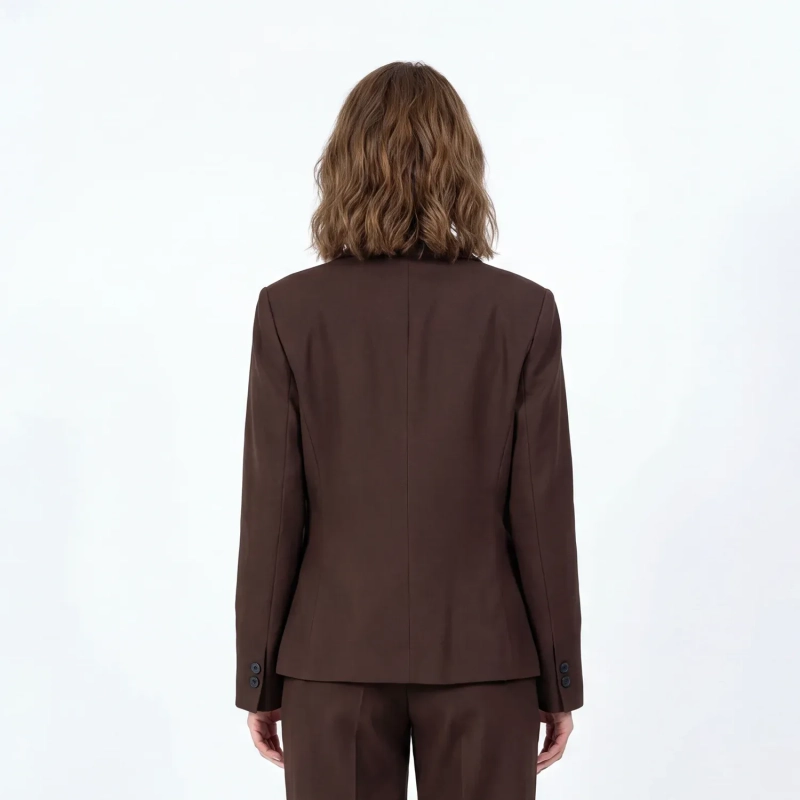 This tailored blazer jacket is designed for a sophisticated and polished silhouette, perfect for creating a structured, professional look. The rich coffee brown color exudes timeless elegance, and the two-button, single-breasted style provides a classic and versatile foundation for your wardrobe.