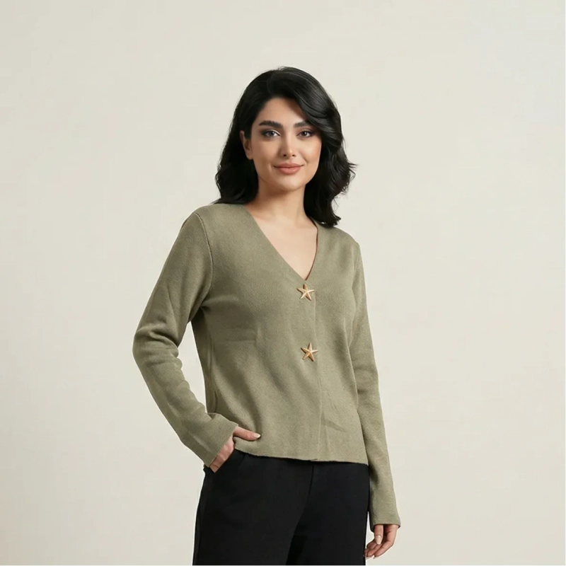 his tailored cardigan top is designed for an elegant and polished aesthetic. It features a sharp V-neckline and distinctive gold-tone starfish buttons, blending a classic silhouette with a playful, coastal detail. The structured fit and smooth, dense knit fabric ensure a flattering look that holds its shape beautifully.