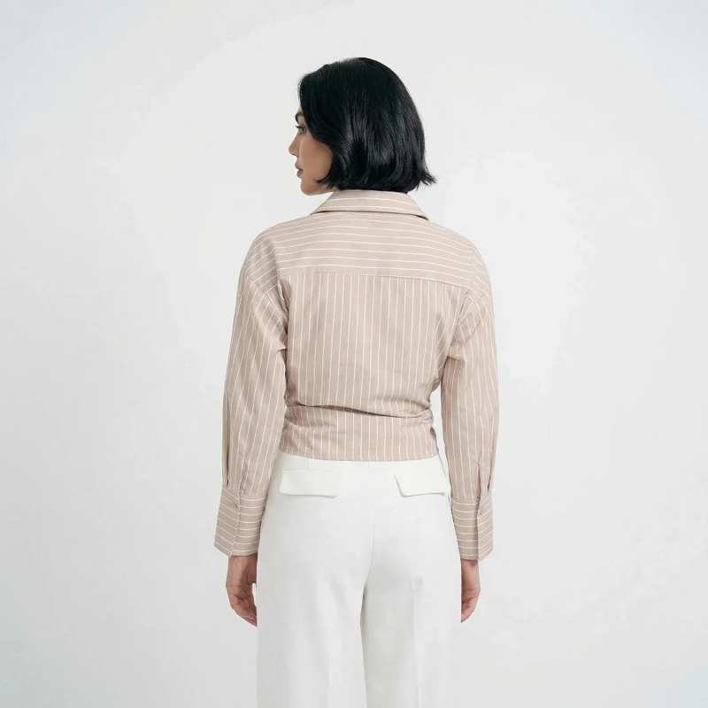 This stylish shirt features a built-in design tie, adding a chic and modern touch to a