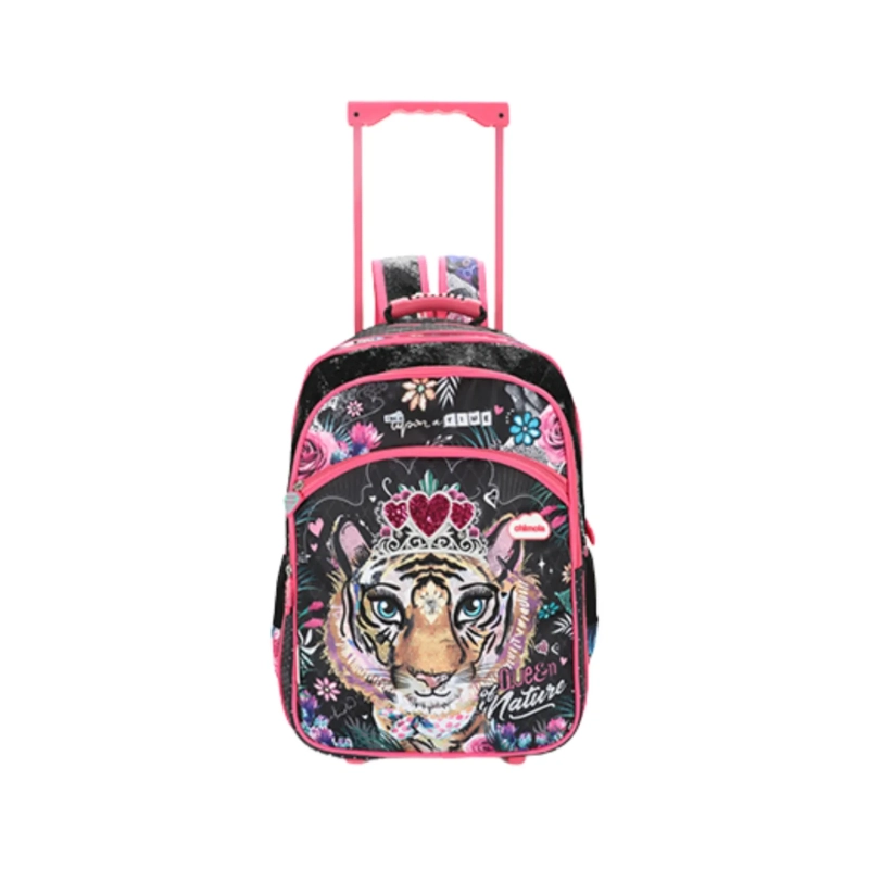 شيمولا علامة تجارية برازيلية تشتهر بلمساتها الإبداعية وتصاميمها عالية الجودة. حقيبة ظهر بطبعة نمر وتاج محاط بأزهار بألوان زاهية، مزودة بعجلات متينة ومقبض تعليق قابل للسحب لسهولة النقل، بالإضافة إلى حجرة رئيسية واسعة وجيوب أمامية لتنظيم عملي، بأبعاد 31×12×22 سم.