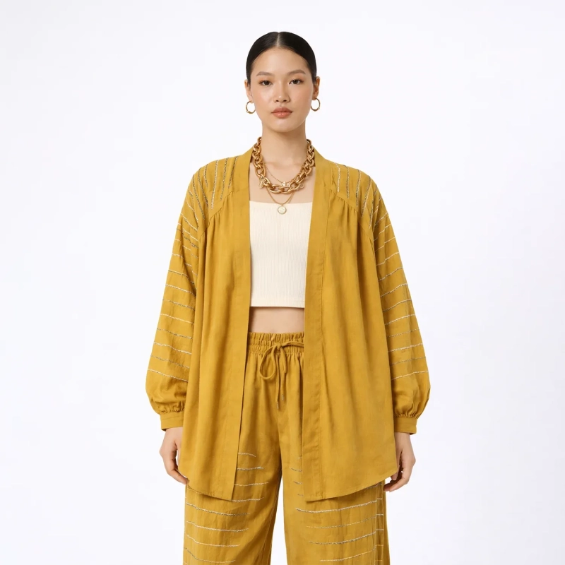 يتميز هذا الكيمونو النسائي الأنيق بتفاصيل خرز زخرفية جميلة وقصة منسدلة وأنيقة، مما يجعله مثالياً لكل من المناسبات الخاصة والإطلالات اليومية الأنيقة.