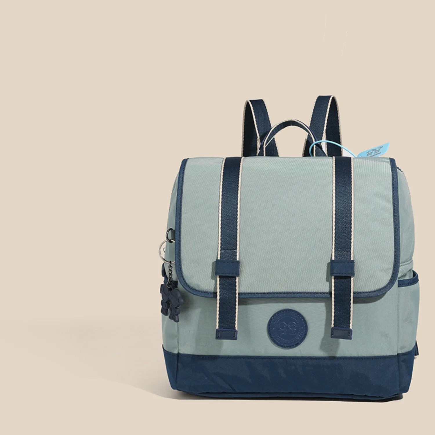 مينينو آند مينينا علامة تجارية برازيلية تُقدم إكسسوارات مرحة وجريئة. حقيبة ظهر ثنائية اللون بدرجات الازرق الفاتح مع حواف زرقاء داكنة وإبزيم أمامي للإغلاق. تصميم عصري ومريح مع مساحات تخزين عملية. الأبعاد: ٢٨ × ٣٣ × ١٥ سم، بالإضافة إلى ٧.٥ سم (٣ بوصات) مع الحزام.