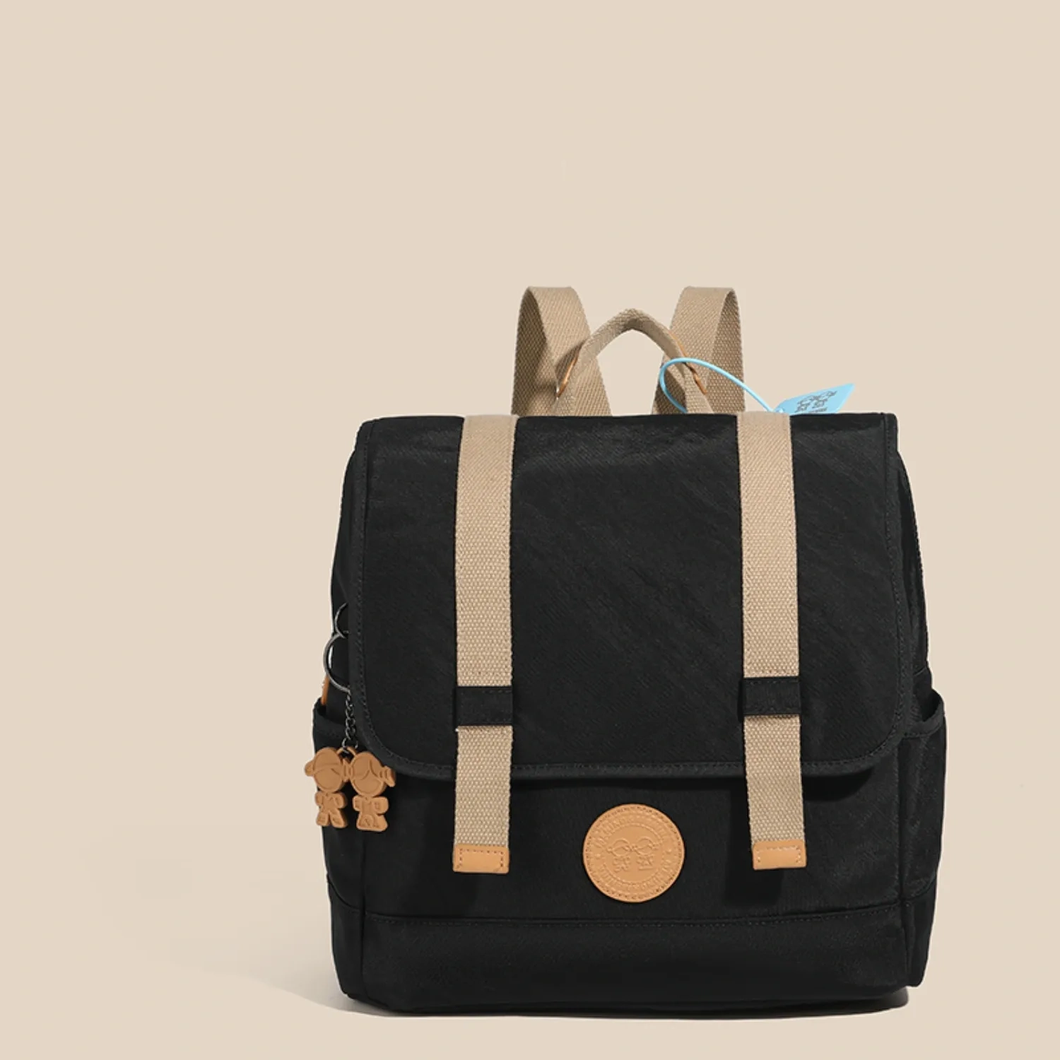 مينينو آند مينينا علامة تجارية برازيلية تُقدم إكسسوارات مرحة وجريئة. حقيبة ظهر سوداء داكنة بتفاصيل كراميل عمودية وتطريز دائري في المنتصف. تتضمن مقبض حمل، وأحزمة كتف قابلة للتعديل، وإبزيمات أمامية لمزيد من الأمان. الأبعاد: ٢٨ × ٣٣ × ١٥ سم، بالإضافة إلى ٧.٥ سم (٣ بوصات) مع الحزام.