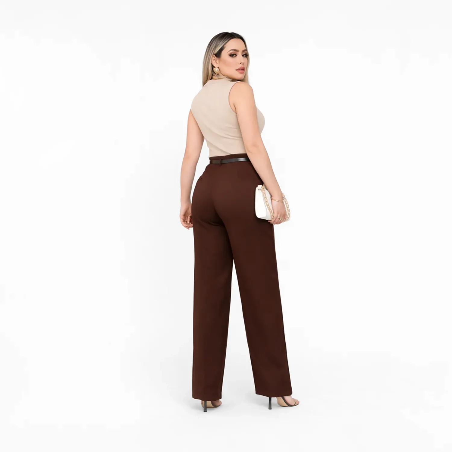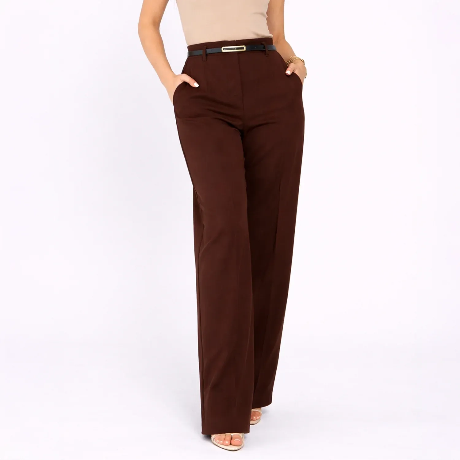 تفاصيل التصميم: خصر مرتفع، واجهة نظيفة، قصة أرجل مستقيمة، وحزام متناسق لتحديد الخصر
