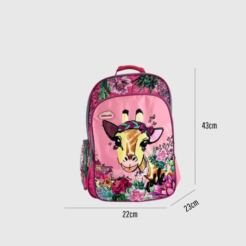 Chimola is a Brazilian brand known for its high-quality materials and playful, artistic designs. This vibrant backpack features a cheerful giraffe surrounded by a lush floral garden, bringing a burst of color and joy to everyday adventures. Crafted in durable fabric with a soft-touch finish, it offers a spacious interior, external side pocket for water bottles, and a comfortable padded back. Measuring 43x22x23 cm, it's ideal for school or day trips. Product available in other Chimola animal-themed designs.