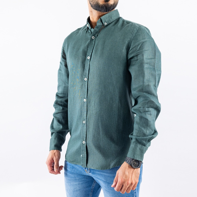 Men's Long Sleeve Shirt - Linen Modern Fit - Olive