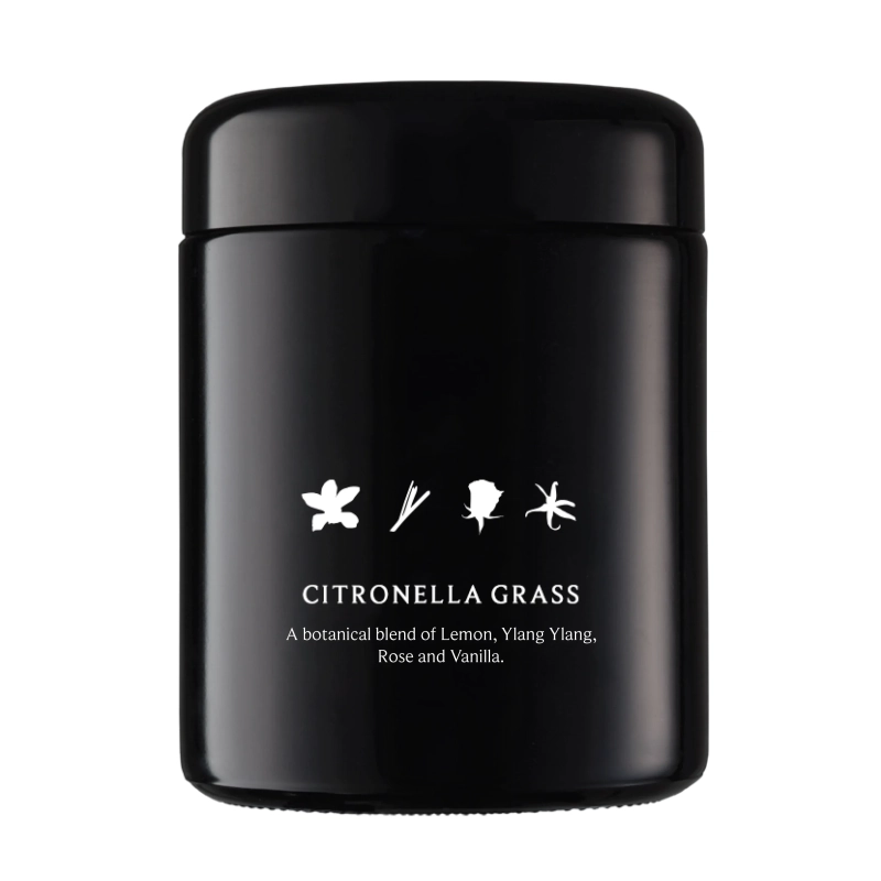 A hand-poured citronella grass candle made with fresh lemongrass and non-GMO soy wax, designed to energize and rejuvenate your space with the freshness of natural leaves. Encased in a violet Miron glass jar, this candle combines ancient alchemy techniques with modern craftsmanship for a clean, long-lasting aroma. Fragrance Notes: • Top: Citrus, Lemon • Middle: Jasmine, Ylang Ylang, Rose • Bottom: Musk, Vanilla Key Benefits: • Refreshing & Energizing: Invigorates your senses with a clean, natural scent. • Long-Lasting Burn: Provides up to 60 hours of aromatic enjoyment. • Handcrafted Quality: Each candle is hand-poured with coconut oil into Miron glass jars. • Preserves Natural Essence: Ancient method keeps scents and natural benefits intact. Ingredients: • Citrus, Lemon • Jasmine • Ylang Ylang • Rose • Musk • Vanilla Specifications: • Weight: 16 oz • Burning Time: 60 hours Dimensions: • Height: 9.1 cm ± 0.1 • Diameter: 7.4 cm +1.2 / -0.8